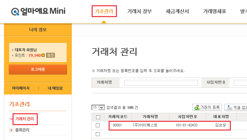 화면 상단의 [기초관리]를 클릭하여 오른쪽 메뉴 중 [거래처 관리]를 선택합니다.