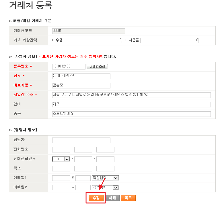 수정하고자 하는 거래처를 마우스로 클릭하면,