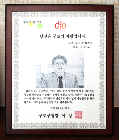 (주)아이퀘스트에서는 2014년부터 구로구 관내 불우 학생에게 매월 장학금을 지급하는 선행을 베풀고 있어